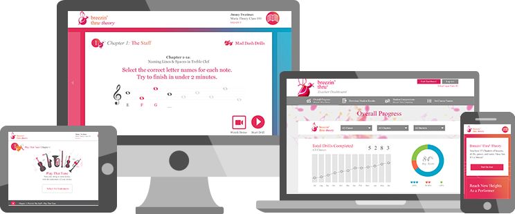 Accessed online, there’s nothing to install, nothing to download, you and your students just log in and start Breezin’ Thru Theory! Students can work in-class, at home or even on the bus!